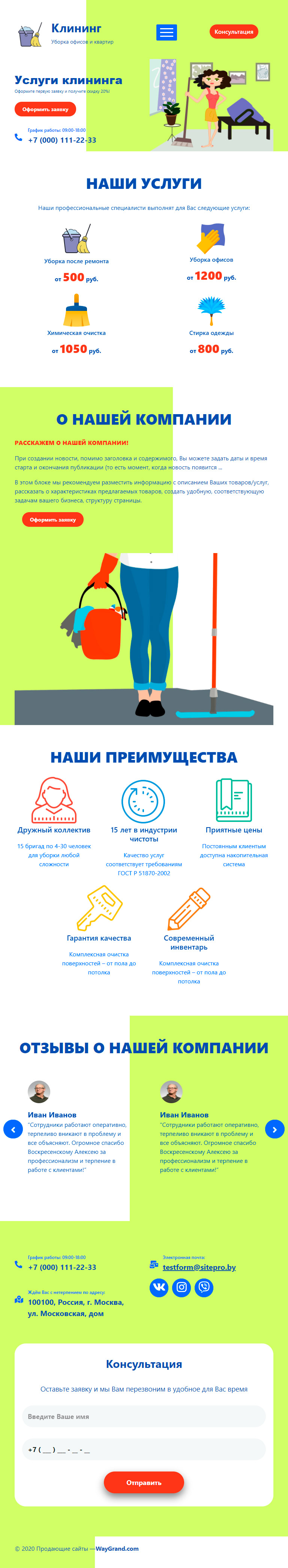 - Подвал с контактами и формой "Консультация"