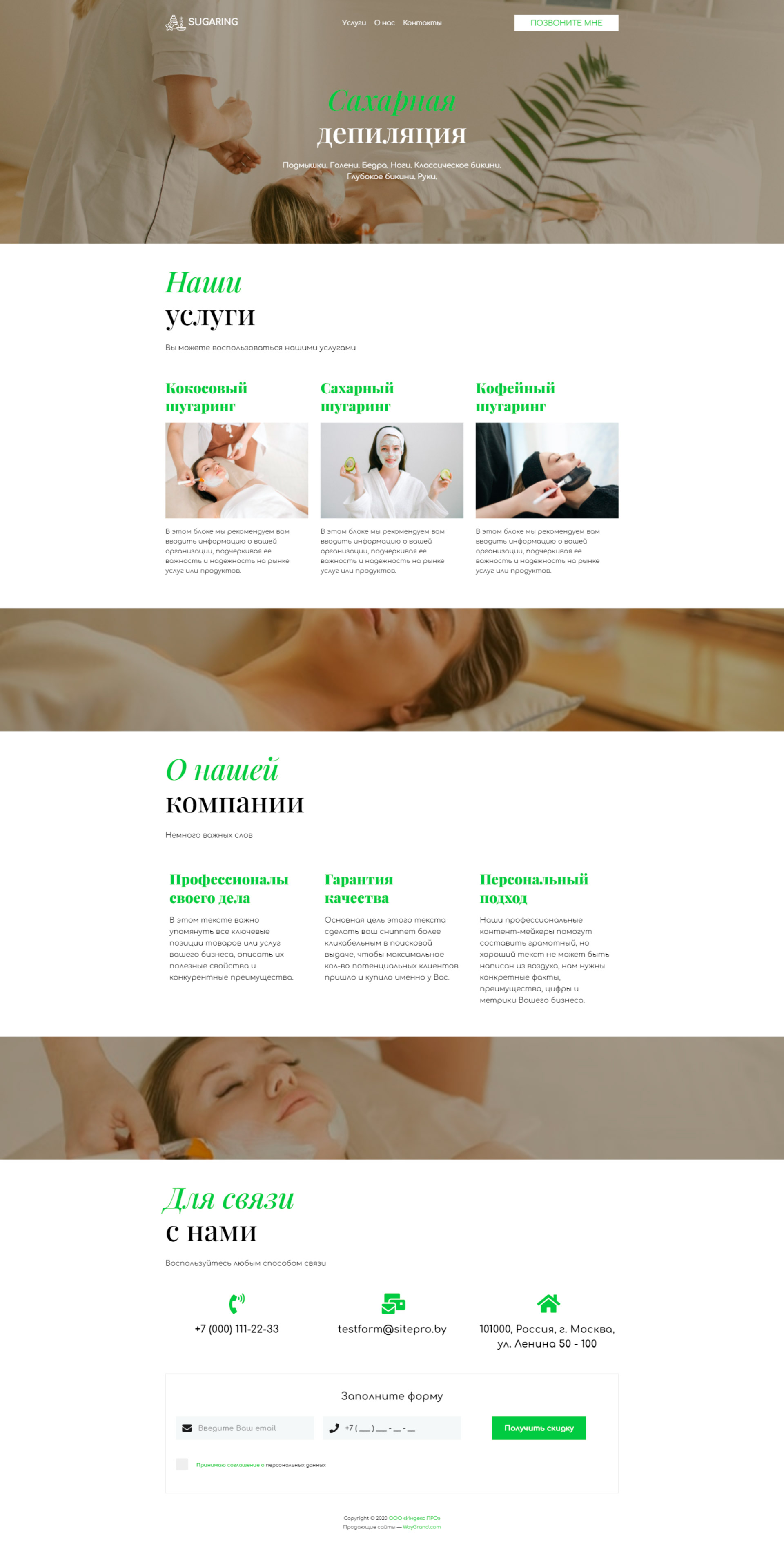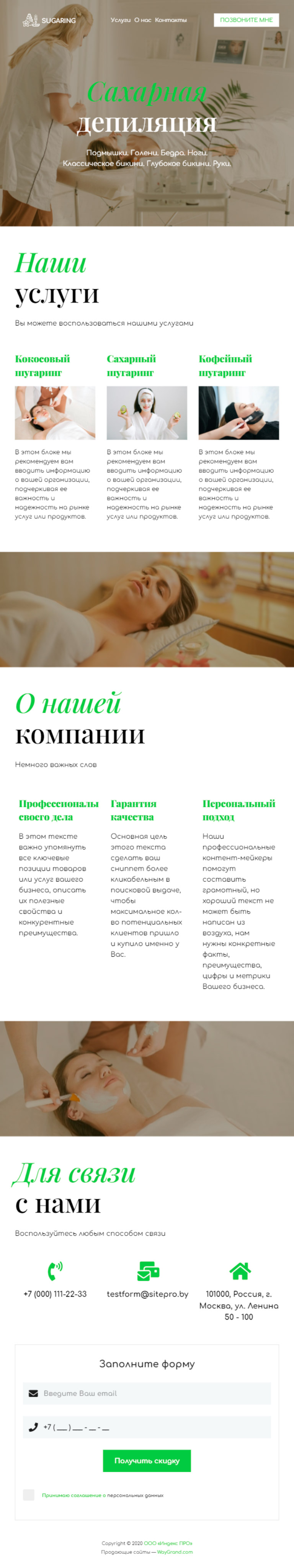 Закажите готовый продающий сайт визитка #1105101 в Петрозаводске за 5-7 дня «под ключ»: свёрстан, отрисован и готов к рекламе. Тематика шаблона «Сахарная депиляция/Шугаринг».