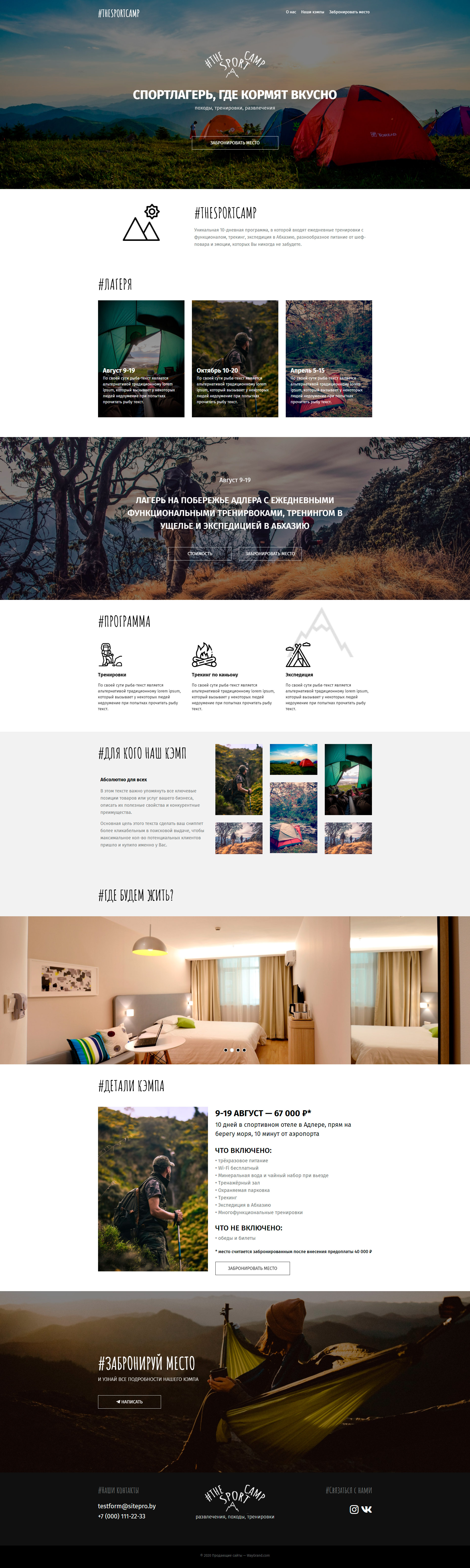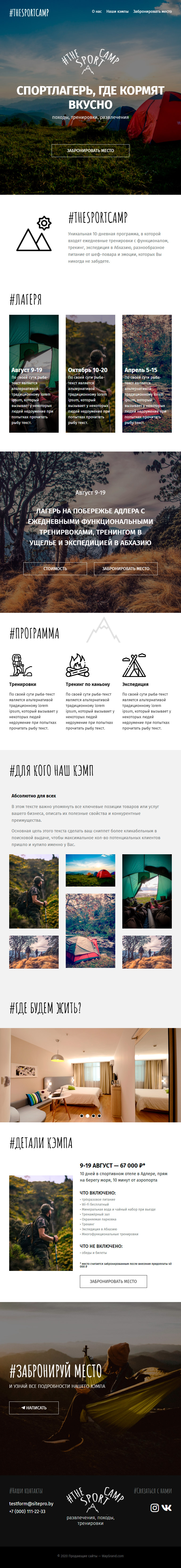 - Промоблок "Спортлагерь" с кнопкой призыва к действию "Заюронировать место"