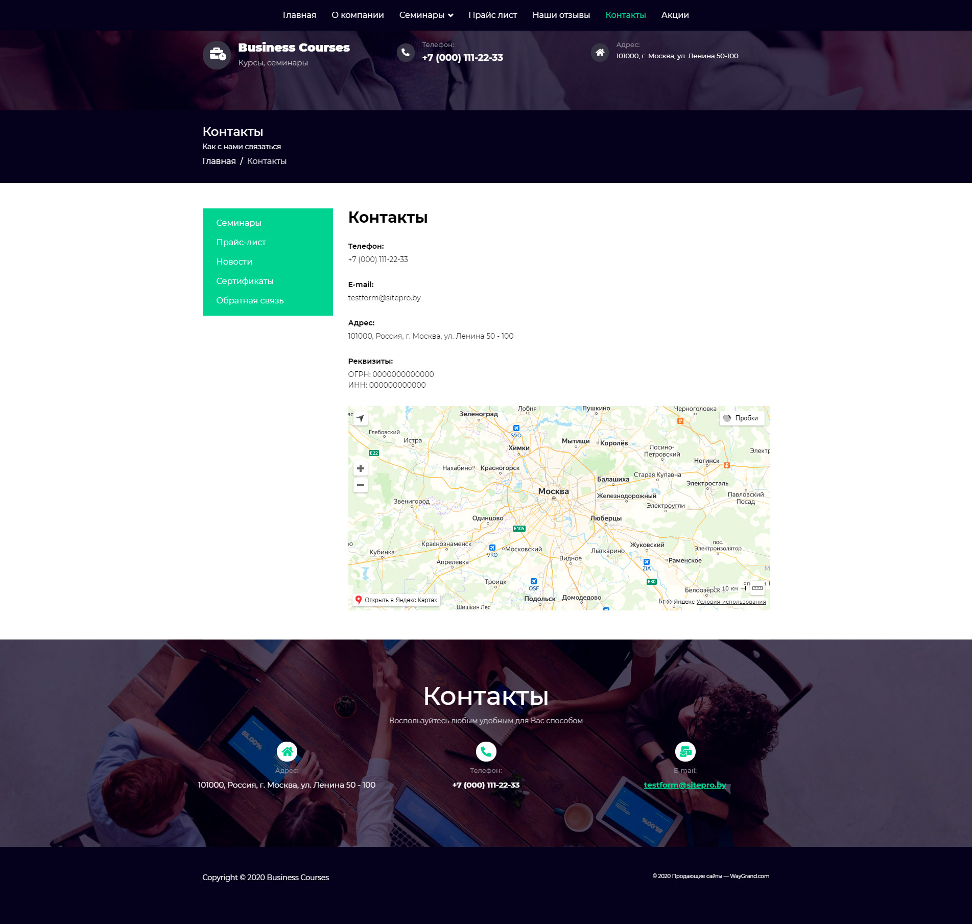 - Промогалерея "Бизнес курсы, семинары" с кнопкой призыва к действию "Обратная связь"